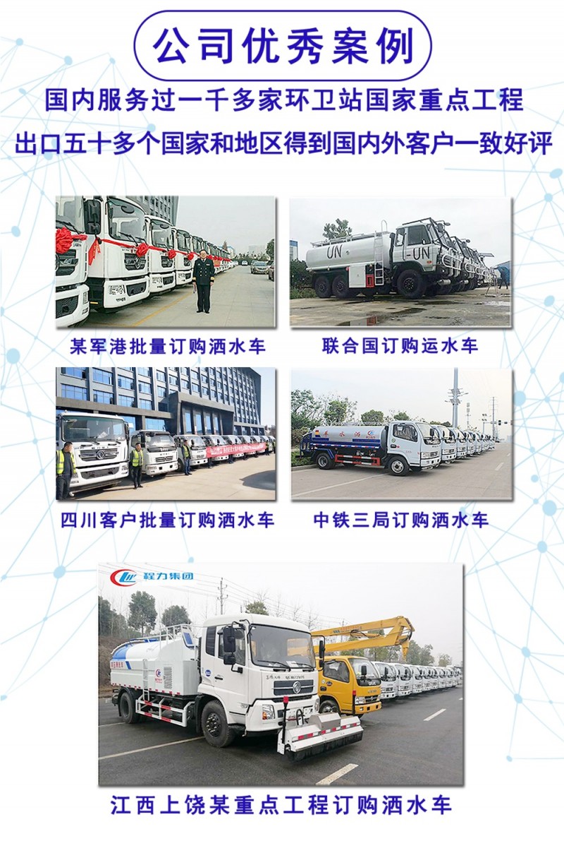 灑水車是湖北程力汽車公司的優(yōu)勢產(chǎn)品!專業(yè)制造各種灑水車二十多年,技術(shù)成熟,質(zhì)量優(yōu)異,市場占有率大。常年備有大量現(xiàn)車,可隨時發(fā)車,是全國最大的灑水車生產(chǎn)銷售基地。
